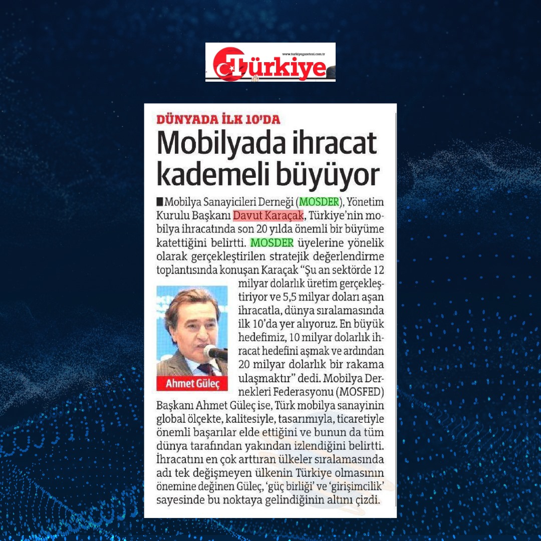 Türkiye’nin mobilya ihracatında son 20 yılda önemli bir büyüme kaydettiğini, yıllık 12 milyar dolarlık üretim ve 5,5 milyar dolarlık ihracat rakamlarına ulaşıldığını söyleyen Karaçak, ihracat hedeflerini büyüterek önce 10, ardından da 20 milyar dolarlık rakama ulaşmayı planladıklarını belirtti. Karaçak yerli ve milli üretim altyapısının da bu hedeflere ulaşmada kritik öneme sahip olduğunu ifade etti.