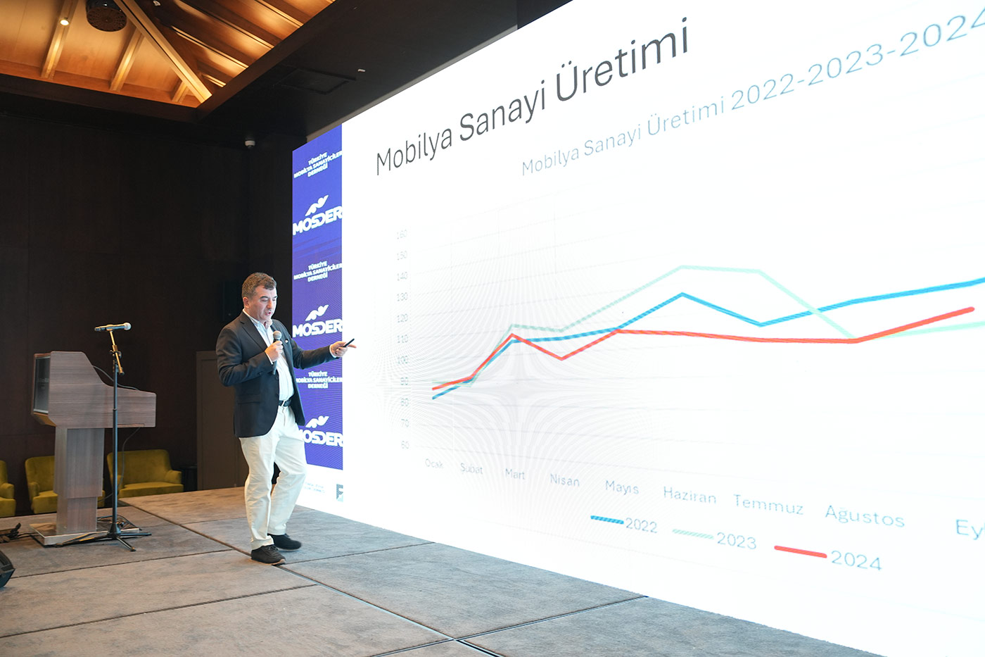 06-07 Aralık 2024 tarihlerinde Bursa Swissotel'de yapılan organizasyon MOSDER Yönetim Kurulu Başkanı Davut Karaçak’ın ev sahipliğinde gerçekleşti. Mobilya sektörünün önde gelen isimleri bu toplantıda buluştu. İhracat, ekonomi ve markalaşmanın konuşulduğu, sunumların yapıldığı toplantıya T.C Ticaret Bakanlığı İhracat Genel Müdürü Mehmet Ali Kılıçkaya ve Tim Başkan Vekili aynı zamanda MOSFED Yönetim Kurulu Başkanı Ahmet Güleç, İstanbul Mobilya Kağıt Ağaç ve Orman Ürünleri Birliği Başkanı Erkan Özkan, TİM Genel Sekreteri Doğuş Tozanlı, İhracat Daire Başkanı Ali Rıza Oktay, Dernek Başkanları ve organizasyonun gerçekleşmesine önemli katkı sağlayan MOSDER Genel Sekreteri Ebru Ünlü katıldı.