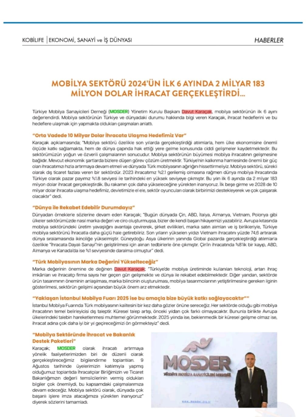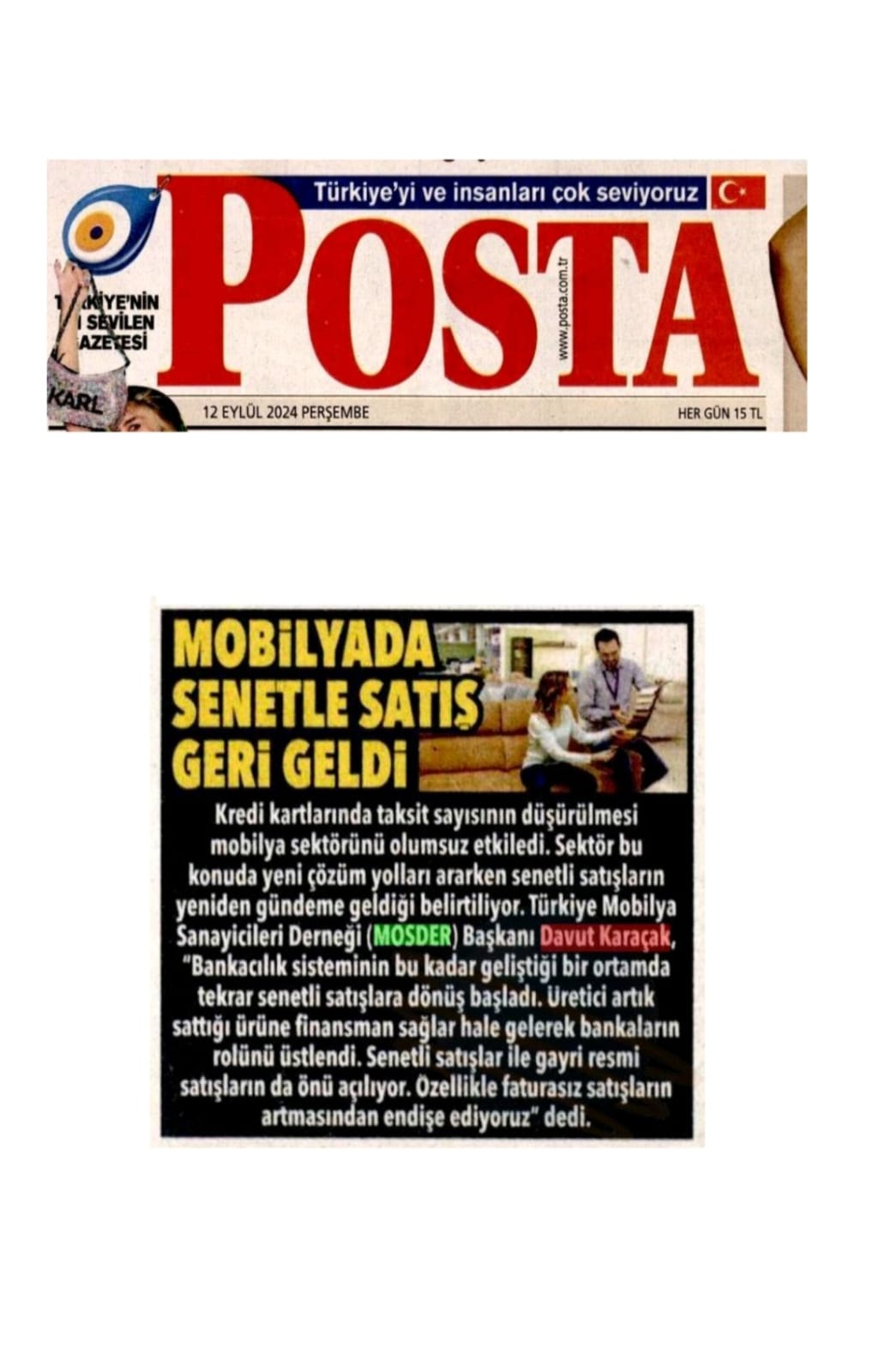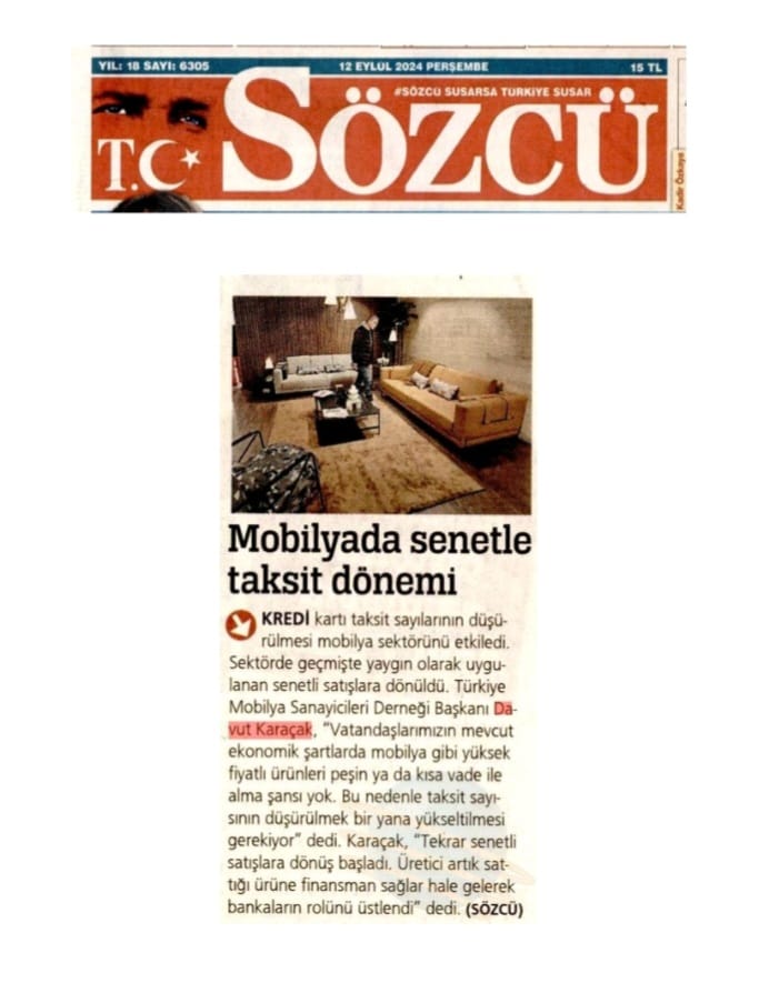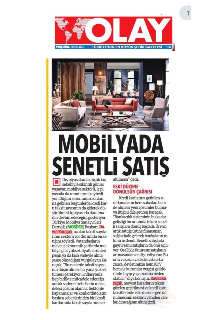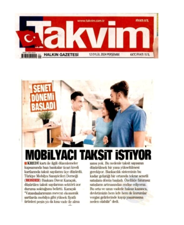 Dış piyasalarda düşük kur sebebi ile sıkıntılı günler yaşayan mobilya sektörü, iç piyasada da umutlarını kaybetmek üzere. Düğün sezonunun sonlarına geldiğimiz bu günlerde, kredi kartı taksit sayısının da giderek düşürülmesi iç piyasada daralmanın devam edeceğini gösteriyor. Türkiye Mobilya Sanayicileri Derneği (MOSDER) Başkanı Davut Karaçak, düşürülen taksit sayılarının sektörü zor duruma soktuğunu belirtti. Karaçak "Vatandaşlarımızın mevcut ekonomik şartlarda mobilya gibi yüksek fiyatlı ürünleri peşin ya da kısa vade ile alma şansı yok. Bu nedenle taksit sayısının düşürülmek bir yana yükseltilmesi gerekiyor. Enflasyonla hep birlikte mücadele edeceğiz ancak sadece üreticilerin mücadelesi çözüm olamaz. Sektörde kapanmalar ve konkordatoların başlıca sebeplerinden biri kredi kartlarında taksit sayılarının azaltılmasıdır" değerlendirmesini yaptı.
