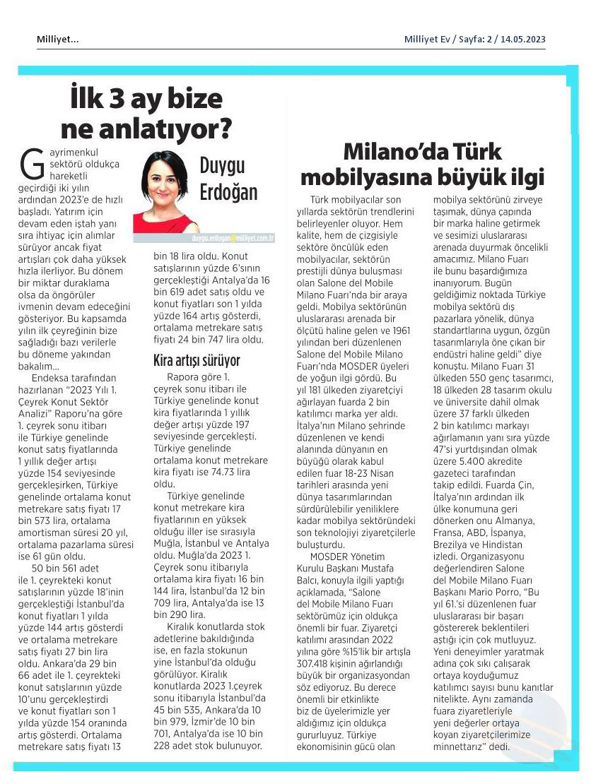 MOSDER Yönetim Kurulu Başkanı Mustafa Balcı, konuyla ilgili yaptığı açıklamada, "Salone del Mobile Milano Fuarı sektörümüz için oldukça önemli bir fuar. Ziyaretçi katılımı arasından 2022 yılına göre %15'lik bir artışla 307.418 kişinin ağırlandığı büyük bir organizasyondan söz ediyoruz. Bu derece önemli bir etkinlikte biz de üyelerimizle yer aldığımız için oldukça gururluyuz. Türkiye ekonomisinin gücü olan mobilya sektörünü zirveye taşımak, dünya çapında bir marka haline getirmek ve sesimizi uluslararası arenada duyurmak öncelikli amacımız. Milano Fuarı ile bunu başardığımıza inanıyorum. Bugün geldiğimiz noktada Türkiye mobilya sektörü dış pazarlara yönelik, dünya standartlarına uygun, özgün tasarımlarıyla öne çıkan bir endüstri haline geldi" diye konuştu. Milano Fuarı 31 ülkeden 550 genç tasarımcı, 18 ülkeden 28 tasarım okulu ve üniversite dahil olmak üzere 37 farklı ülkeden 2 bin katılımcı markayı ağırlamanın yanı sıra yüzde 47'si yurtdışından olmak üzere 5.400 akredite gazeteci tarafından takip edildi. Fuarda Çin, İtalya'nın ardından ilk ülke konumuna geri dönerken onu Almanya, Fransa, ABD, İspanya, Brezilya ve Hindistan izledi. Organizasyonu değerlendiren Salone del Mobile Milano Fuarı Başkanı Mario Porro, "Bu yıl 61.'si düzenlenen fuar uluslararası bir başarı göstererek beklentileri aştığı için çok mutluyuz. Yeni deneyimler yaratmak adına çok sıkı çalışarak ortaya koyduğumuz katılımcı sayısı bunu kanıtlar nitelikte. Aynı zamanda fuara ziyaretleriyle yeni değerler ortaya koyan ziyaretçilerimize minnettarız." dedi.