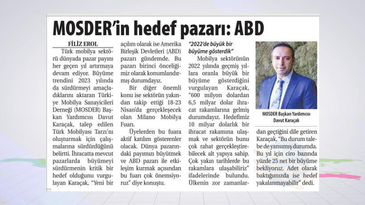 Türk mobilya sektörü dünyada pazar payını her geçen yıl artırmaya devam ediyor. Büyüme trendini 2023 yılında da sürdürmeyi amaçladıklarını aktaran Türkiye Mobilya Sanayicileri Derneği (MOSDER) Başkan Yardımcısı Davut Karaçak, talep edilen Türk Mobilyası Tarzı’nı oluşturmak için çalışmalarına sürdürdüğünü belirtti. İhracatta mevcut pazarlarda büyümeyi sürdürmenin kritik bir hedef olduğunu vurgulayan Karaçak, “Yeni bir açılım olarak ise Amerika Birleşik Devletleri (ABD) pazarı gündemde. Bu pazarı birinci önceliğimiz olarak konumlandırmış durumdayız. Bir diğer önemli konu ise sektörün yakından takip ettiği 18-23 Nisan’da gerçekleşecek olan Milano Mobilya Fuarı. Üyelerden bu fuara aktif katılım gösterenler olacak. Dünya pazarındaki payımızı büyütmek ve ABD pazarı ile etkileşim kurmak açısından bu fuarı çok önemsiyoruz” diye konuştu.
