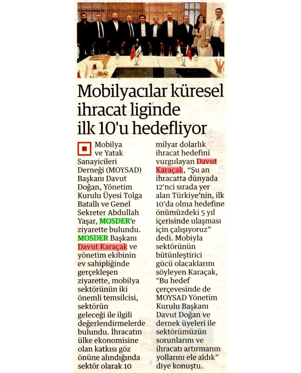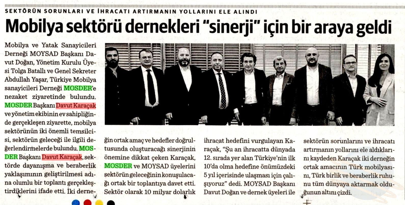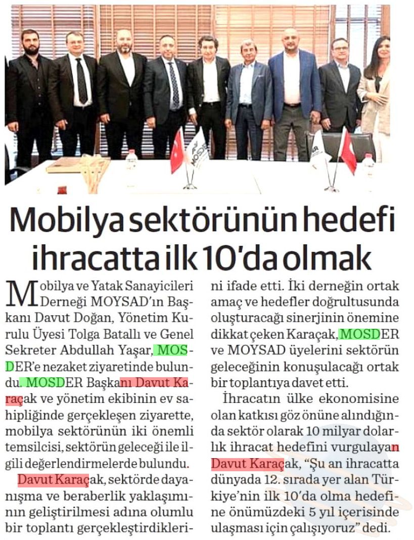 MOSDER Başkanı Davut Karaçak yaptığı açıklamada; “Mobilya sektöründe, adında Türkiye olan bir dernek olarak çeşitli kurumlar ve derneklerle görüşmelere devam edip sektörün bütünleştirici gücü olacağız. Bu hedef çerçevesinde de MOYSAD Yönetim Kurulu Başkanı Davut Doğan ve dernek üyeleri ile sektörümüzün sorunlarını ve ihracatı artırmanın yollarını ele aldık” dedi. Karaçak ayrıca MOSDER ve MOYSAD’ın ortak amacının Türk mobilyasını, Türk birlik ve beraberlik ruhunu tüm dünyaya aktarmak olduğunun altını çizdi.